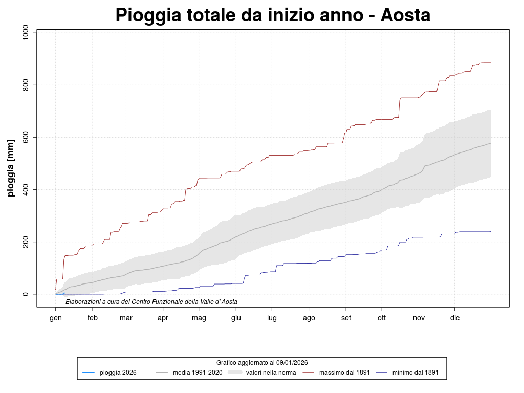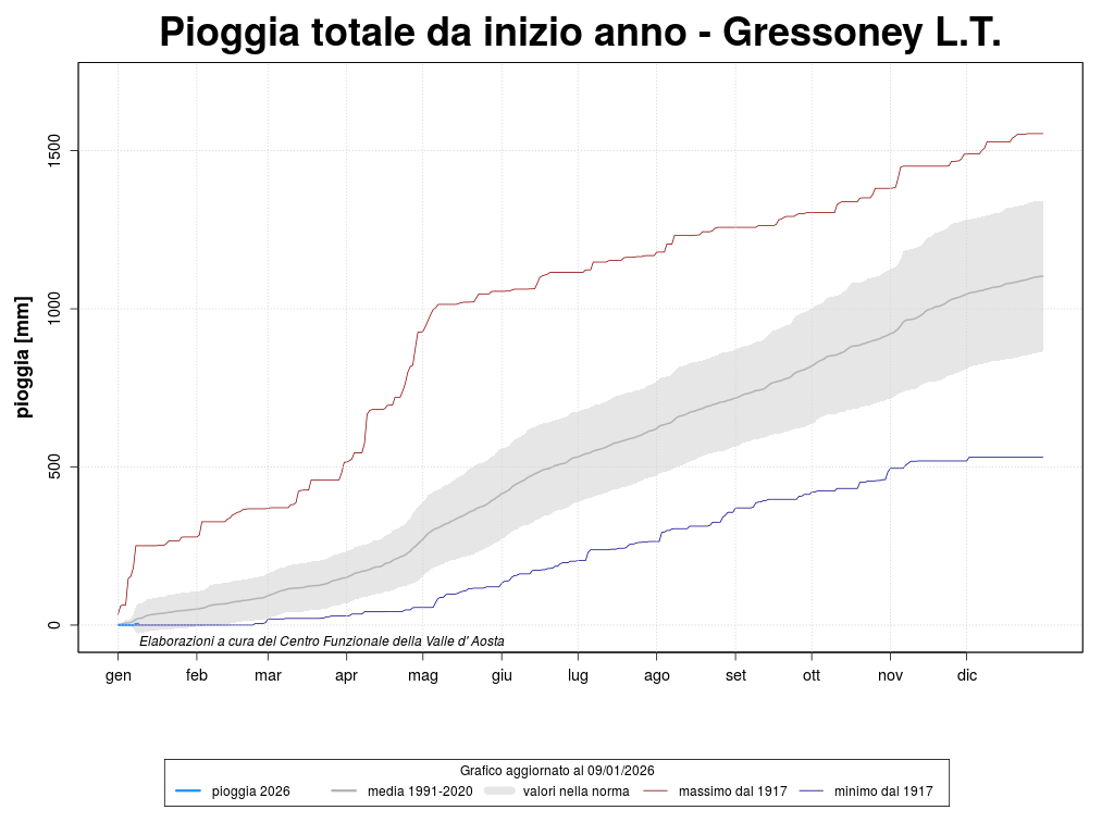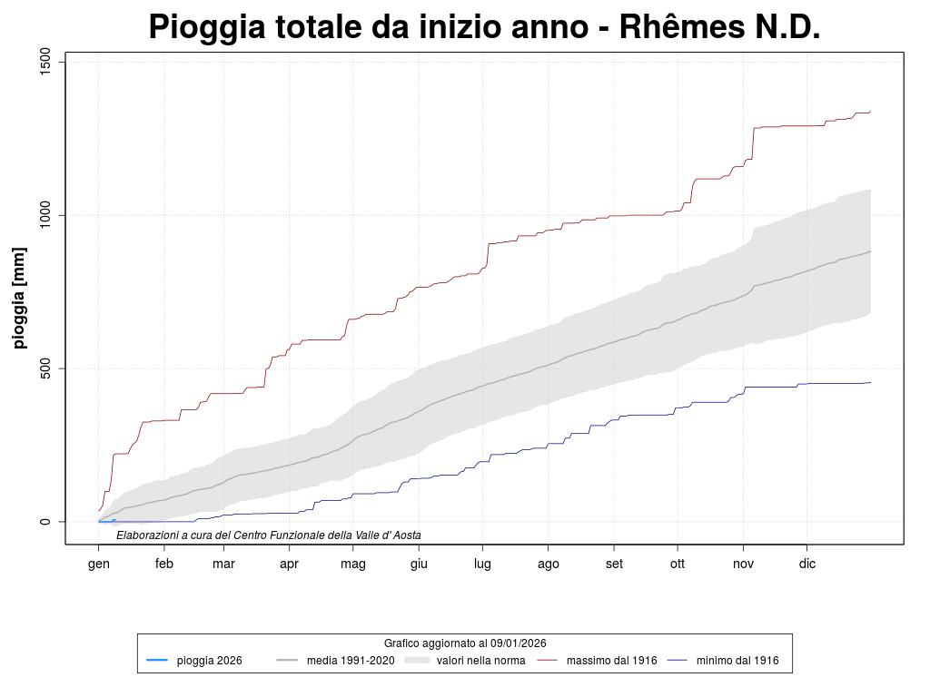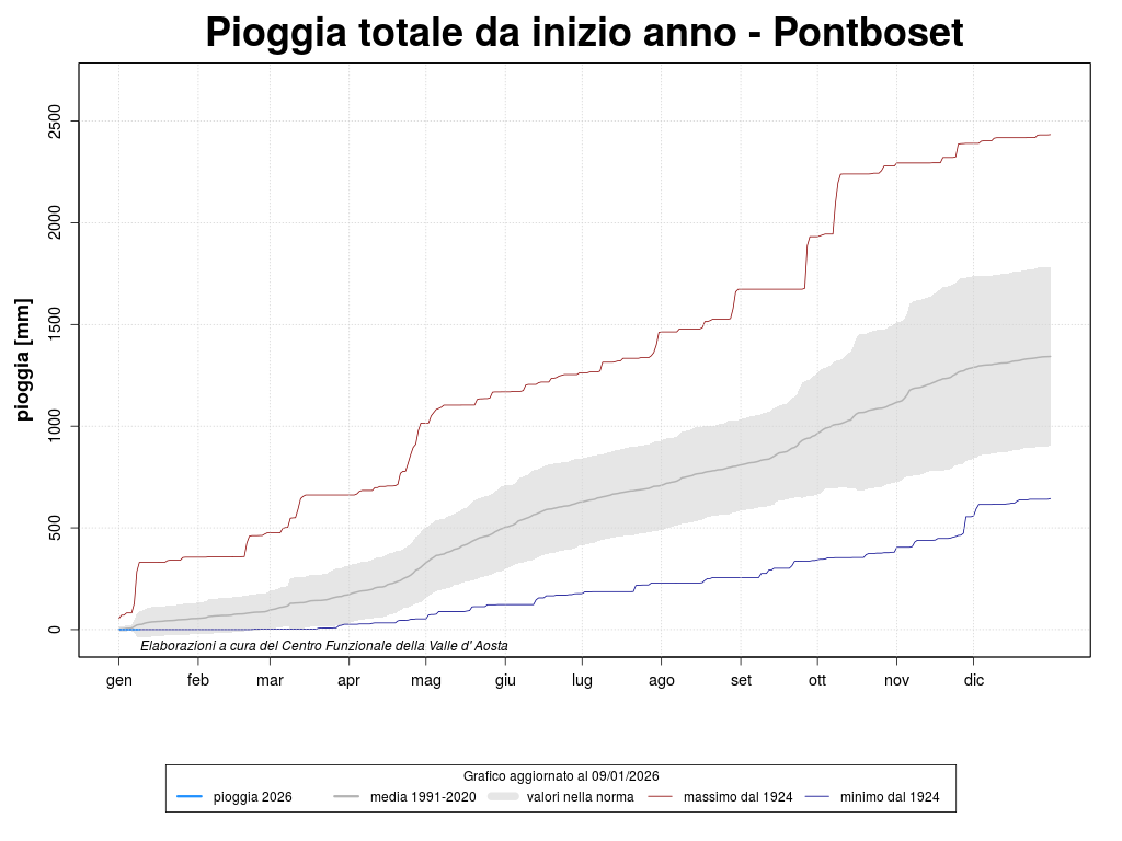 The climatological stations are characterized by long and coherent series of precipitations. The weather station considered are Aosta, Rhêmes-Notre-Dame, Pontboset and Gressoney-La-Trinité. The graph shows the total precipitation, since the beginning of the year, of four stations that have a long historical series.