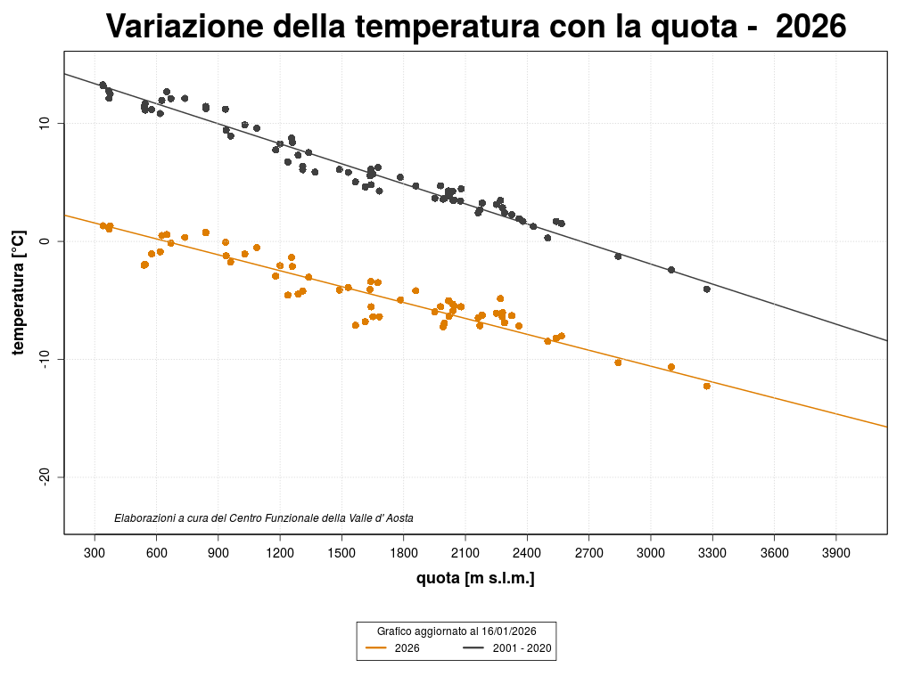 Each point in the graph is the mean temperature of a weather station related to its altitude. The orange points are referred to the selected year, whereas the grey points are referred to the average temperature of the previous years. The straight lines are the linerar regressions of those lines.