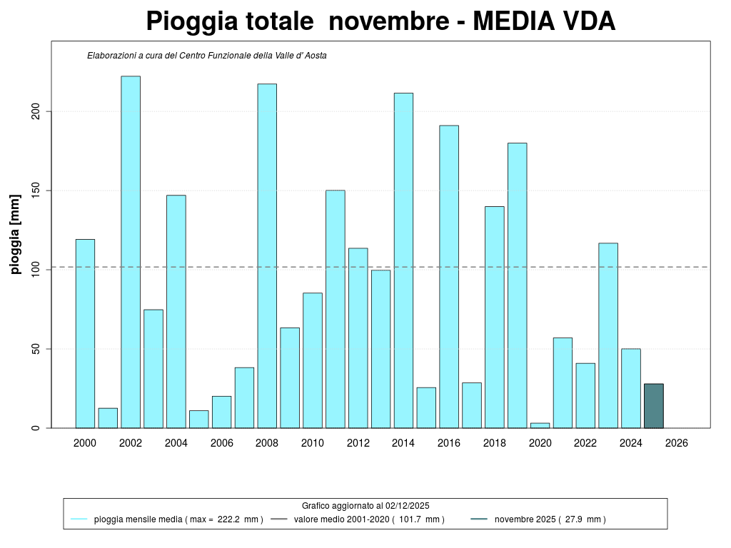 La precipitazione cumulata media sul territorio regionale, nel mese di novembre 2025, è di 28 mm, valore decisamente inferiore alla media del ventennio 2001-2020, pari a 102 mm; le precipitazioni sono state più abbondanti sulla dorsale nord-occidentale della regione (sono stati registrati 155 mm al Gran-San-Bernardo).