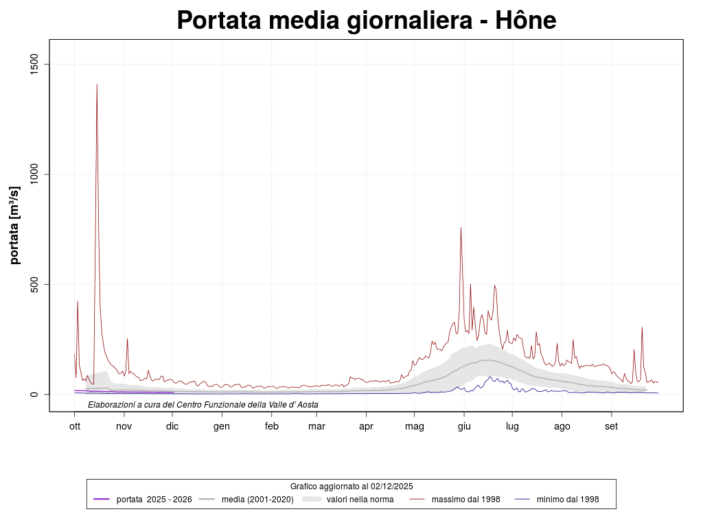 L'analisi dei deflussi eseguita sulle stazioni di rilevamento ambientale sulla Dora Baltea (Nus, Hône, Champdepraz e Tavagnasco*) evidenzia, per il mese di novembre, portate in linea all'andamento medio delle portate del periodo.