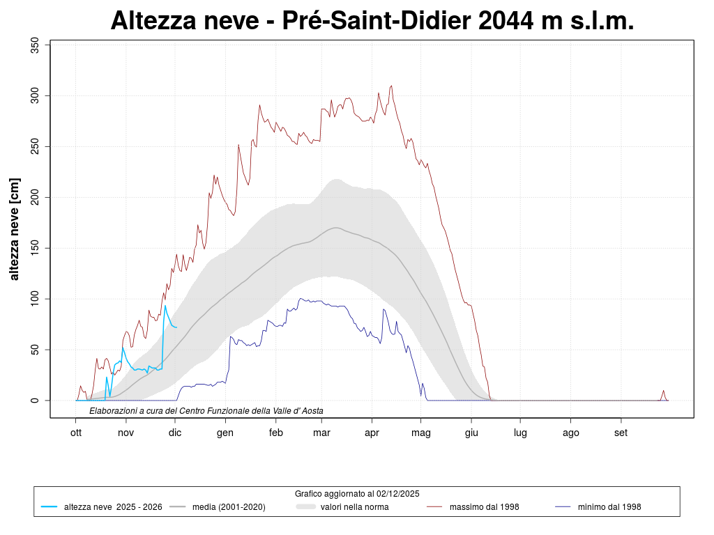 Se si considerano le precipitazioni da inizio dell'anno per quattro stazioni di riferimento (Aosta, Pontboset, Gressoney-La-Trinité e Rhêmes-Notre-Dame), il valore cumulato dal 1 gennaio al 30 novembre è nella norma, rispetto al trentennio di riferimento 1991-2020.