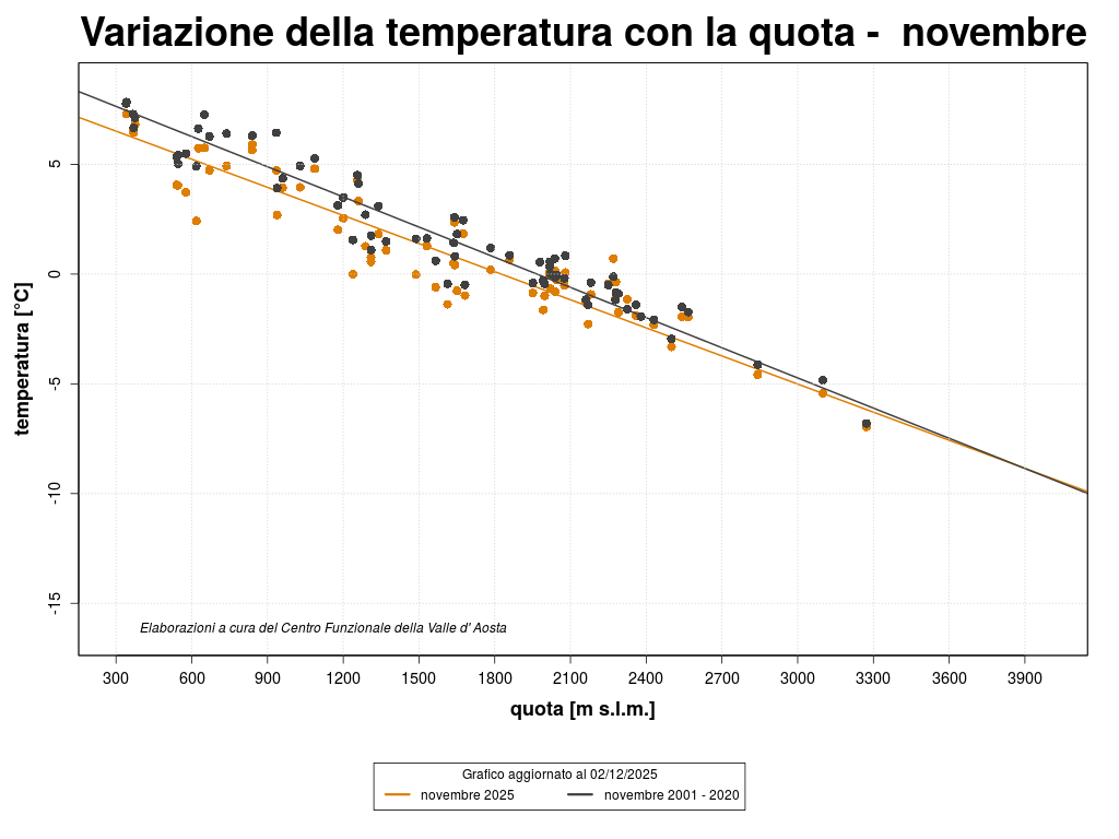 Lo zero termico è calato bruscamente a metà mese, arrivando a valori minimi il 22-23 novembre (300 m s.l.m.).