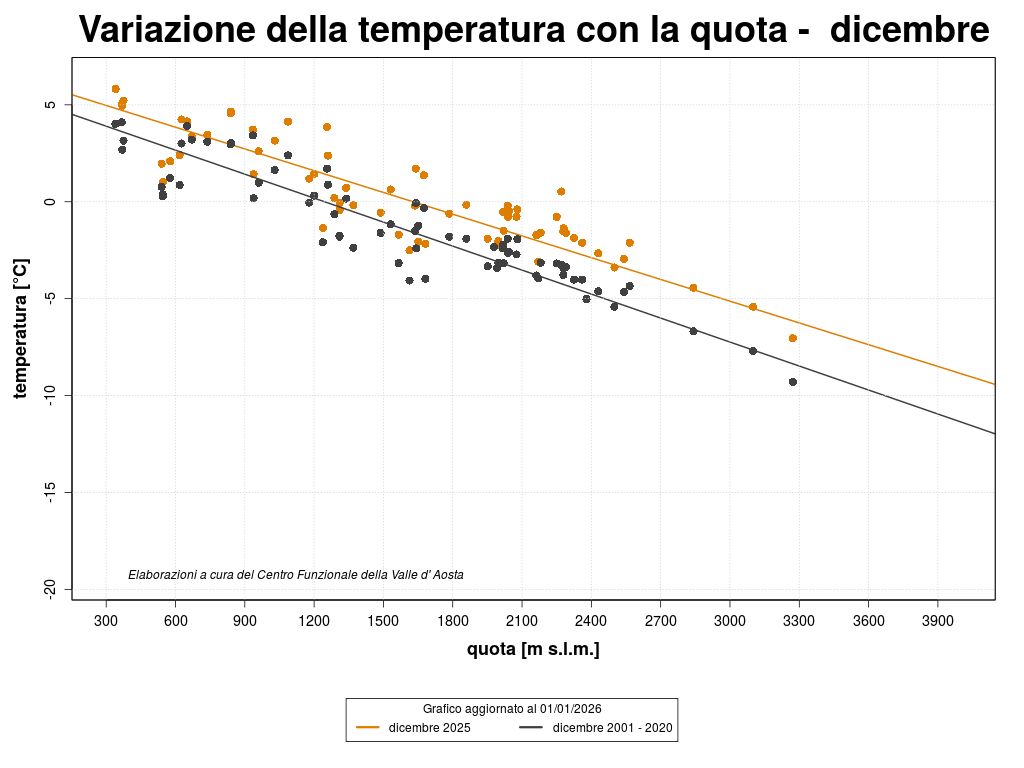 Le temperature del mese di dicembre in valle d'Aosta sono state superiori alla media del ventennio 2001-2020, con gradiente maggiore alle quote più elevate.