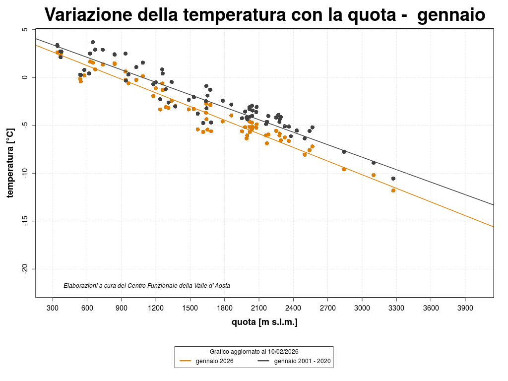 Le temperature medie del mese di gennaio, registrate dalle stazioni della rete del Centro Funzionale, sono state inferiori alla media del ventennio 2001-2020 a tutte le quote; le temperature sono state più basse nei primi dieci giorni del mese, in seguito sono aumentate, per calare nuovamente negli ultimi dieci giorni di gennaio, come si osserva dall'andamento dello zero termico. Confrontando le temperature massime e minime giornaliere si osserva che le massime sono state inferiori alla media storica, mentre le minime sono state superiori alla media storica.
