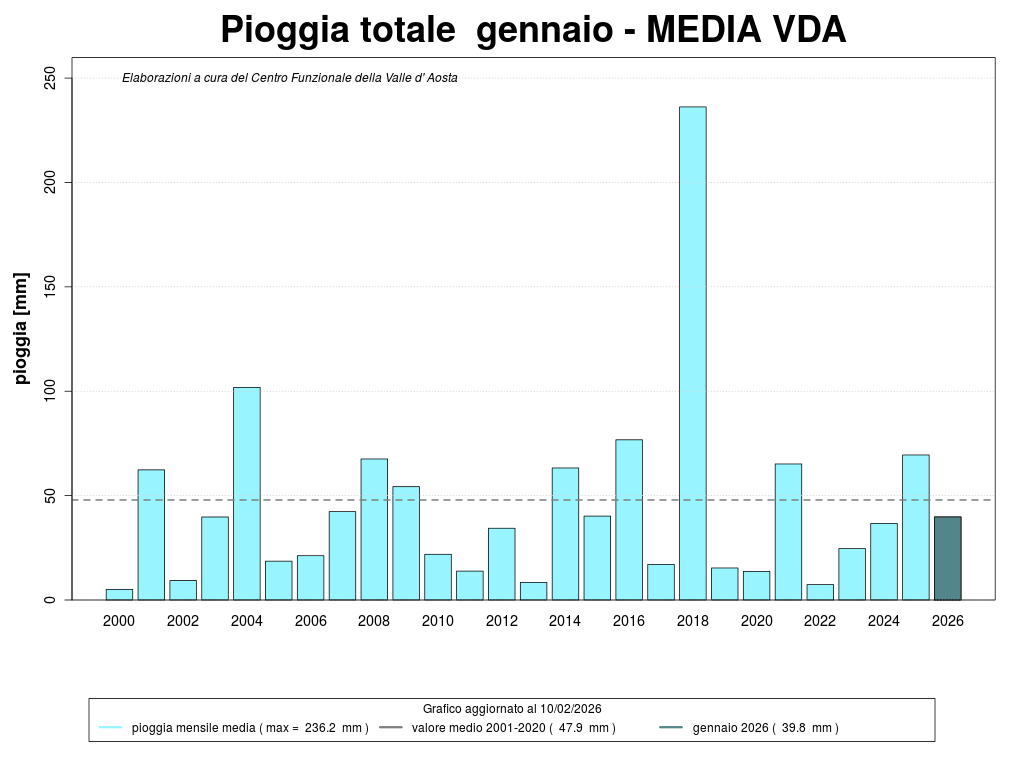 La precipitazione cumulata media sul territorio regionale, nel mese di gennaio 2026, è di circa 40 mm, valore inferiore alla media del ventennio 2001-2020, pari a circa 48 mm; tuttavia il numero di giorni piovosi (ossia con precipitazione superiore a 1 mm) è stato superiore alla media (ad Aosta 9 giornate piovose contro una media di 6).