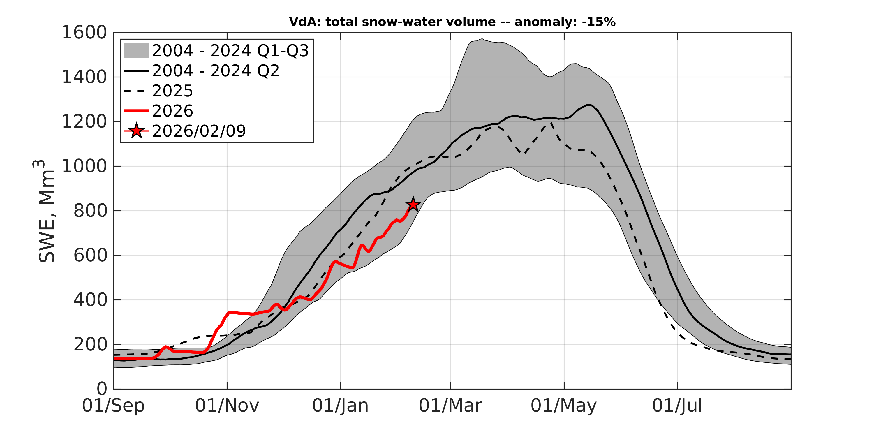 Il valore dell'indice SWE (Snow Water Equivalent) è cresciuto nel corso del mese di gennaio in seguito alle frequenti deboli nevicate; l'indice risulta inferiore alla media del periodo storico di riferimento (2004-2024), ma entro i limiti della norma.