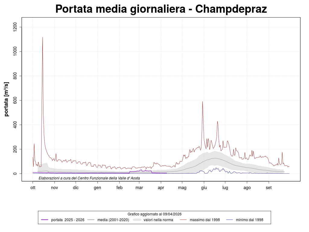 L'analisi dei deflussi eseguita sulle stazioni di rilevamento ambientale sulla Dora Baltea (Nus, Hône, Champdepraz e Tavagnasco*) evidenzia, per il mese di marzo, portate giornaliere in linea con l'andamento medio delle portate del periodo. A causa di un fermo impianto i valori registrati dagli idrometri di Hône e Champdepraz appaiono superiori alla media, tuttavia sono da considerarsi in linea con le portate del periodo.