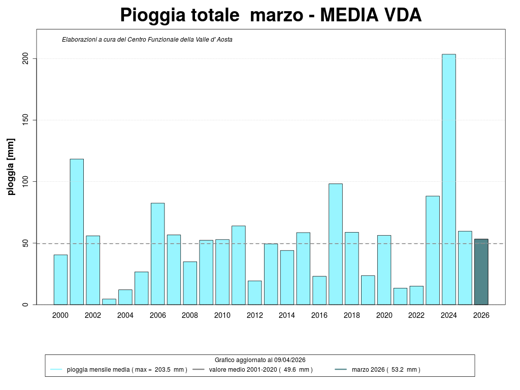 Se si considerano le precipitazioni da inizio dell'anno, il valore cumulato dal 1 gennaio al 31 marzo, per quattro stazioni di riferimento (Aosta, Pontboset, Gressoney-La-Trinité e Rhêmes-Notre-Dame), è nella norma, rispetto al trentennio di riferimento 1991-2020.
