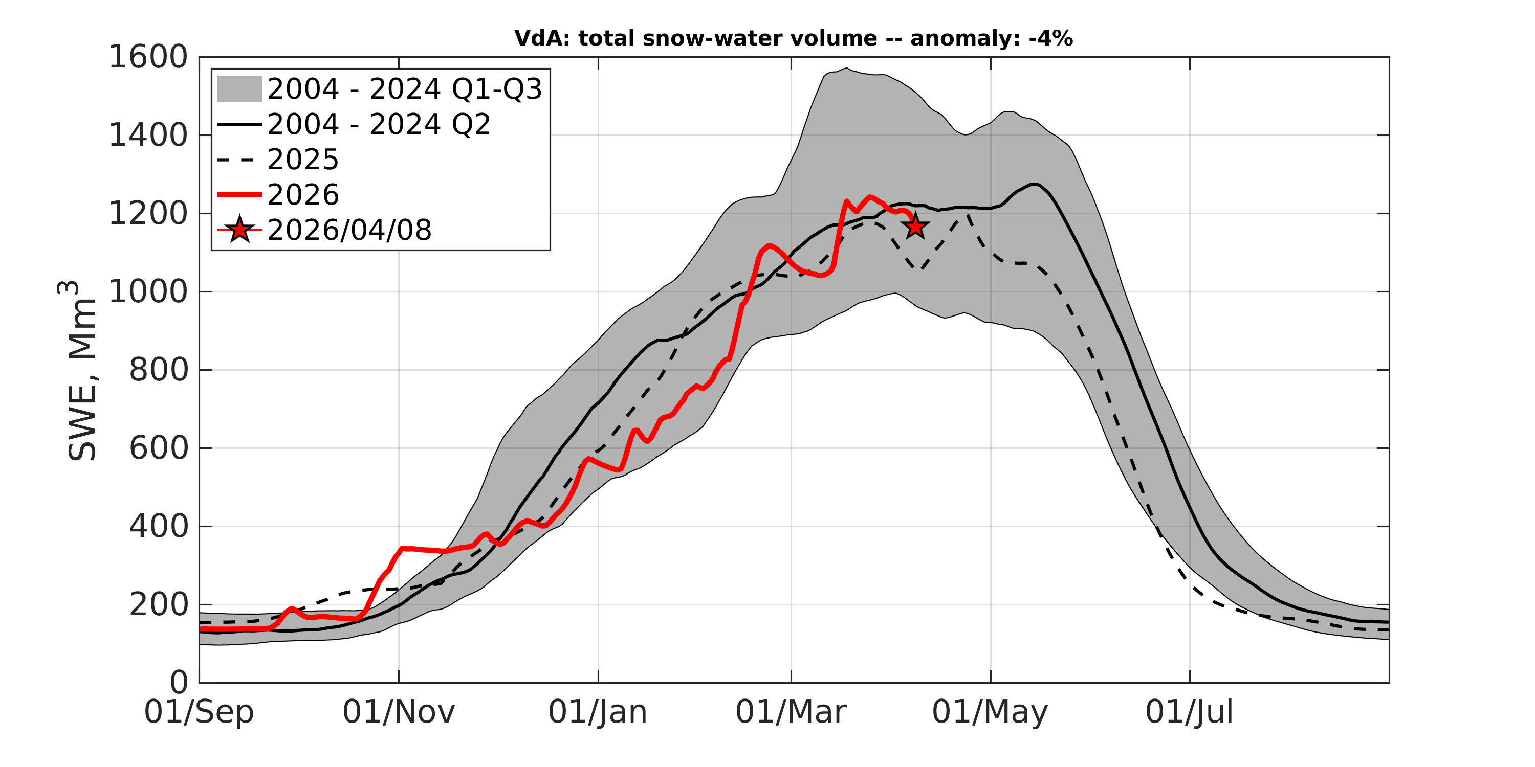 Il contenuto in acqua della neve (rappresentato dall'indice SWE) è in linea con la media dell'ultimo ventennio.