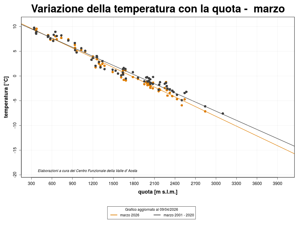 L'altezza della neve al suolo, misurata dalle stazioni di Courmayeur, Pré-Saint-Didier, Saint-Rhémy-en-Bosses e Gressoney-Saint-Jean, risulta, durante tutto il mese di marzo, nel range di normalità. Le stazioni rilevano la presenza di neve al suolo a partire da circa 1700-1800 m s.l.m. e, mediamente, a 2500 m s.l.m. l'altezza del manto è pari a circa 100-150 cm.